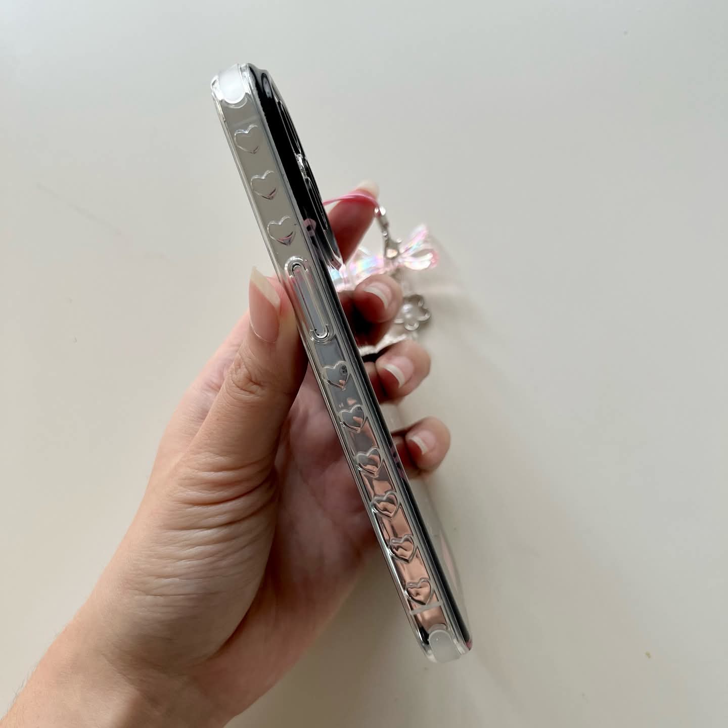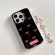 This elegant phone case features a glossy black finish decorated with cute pink bow prints, creating a sweet and stylish look. Designed for iPhones with a triple-camera layout, it offers a precise fit while protecting your phone from scratches, dust, and everyday wear. The case comes with a detachable pink wrist strap adorned with a crystal-style butterfly, pearl accents, floral charms, and a delicate angel wing detail for added charm and convenience. Finished with a subtle CNISS KAHEY logo, this case is perfect for those who love a feminine, trendy, and practical phone accessory.