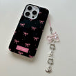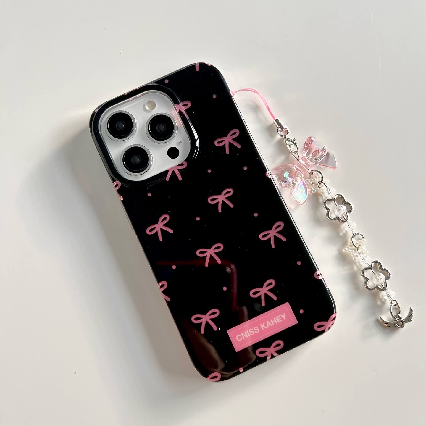 elegant phone case features a glossy black finish with cute pink bow prints with charm